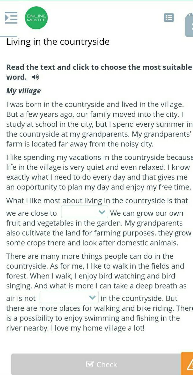 I was born in the countryside and lived in the village. But a few years ago, our family moved into the city. I study at school in the city, but I spend every summer in the countryside at my grandparents. My grandparents’ farm is located far away from the noisy city.
