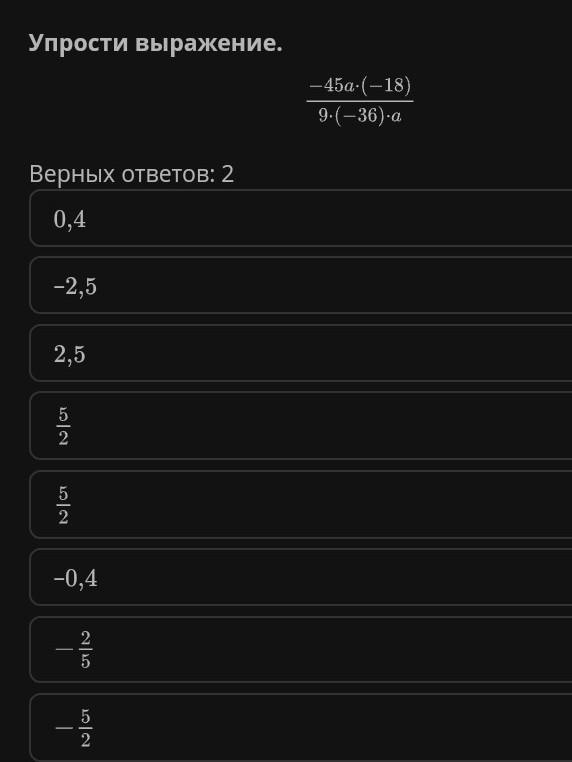 = - 45×18 /9×36= - 5×18 /36= - 5/2= - 2 1/2= - 2,5