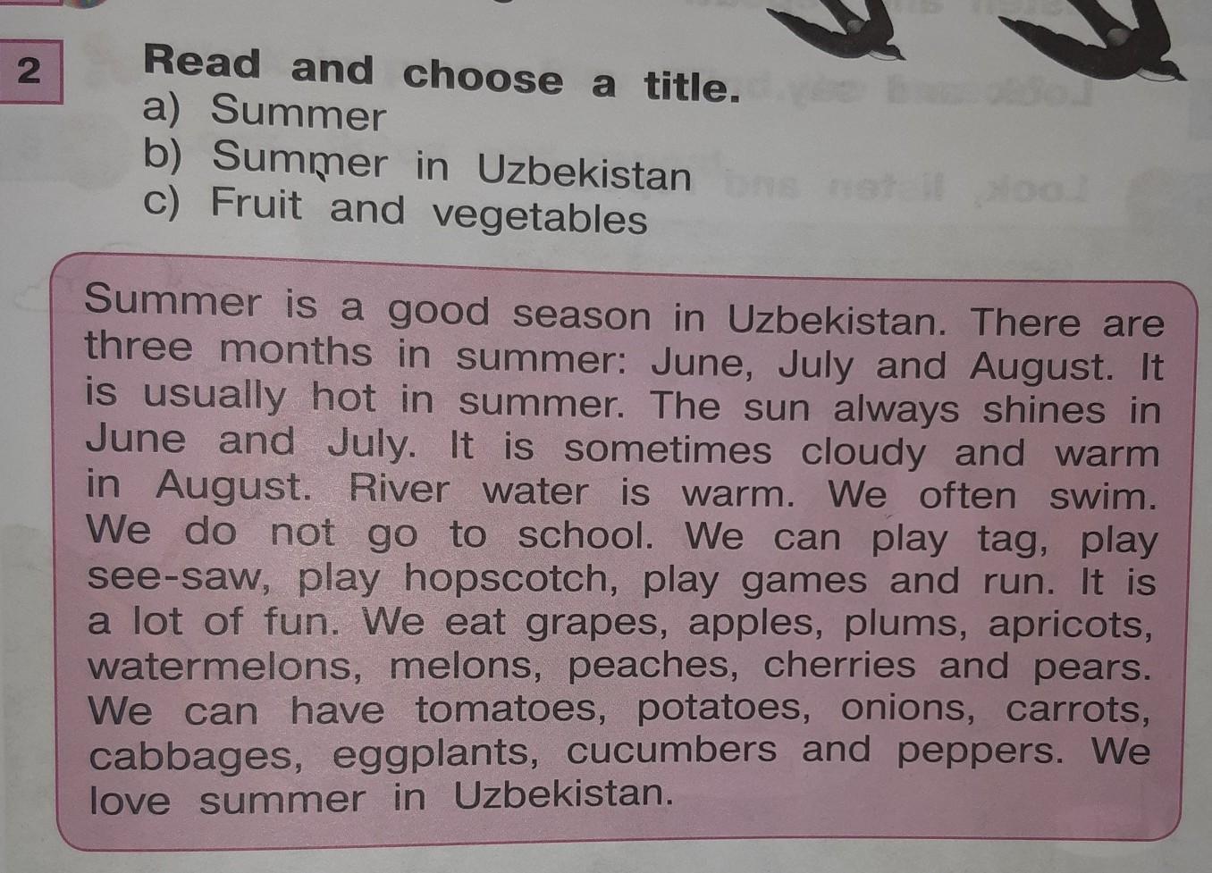 Summer is a good season in Uzbekistan. There are three months in summer: June, July and August. It is usually hot in summer. The sun always shines in June and July. It is sometimes cloudy and warm in August. River water is warm. We often swim. We do not go to school. We can play tag, play see-saw, play hopscotch, play games and run. It is a lot of fun. We eat grapes, apples, plums, apricots, watermelons, melons, peaches, cherries and pears. We can have tomatoes, potatoes, onions, carrots, cabbages, eggplants, cucumbers and peppers. We love summer in Uzbekistan.
