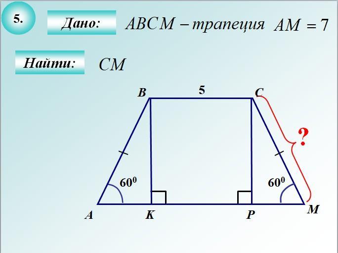 1. Исходя из свойств трапеции: BC||AM, значит BC||KP, BK и CP - перпендикуляры, тогда BC = KP = 5см;