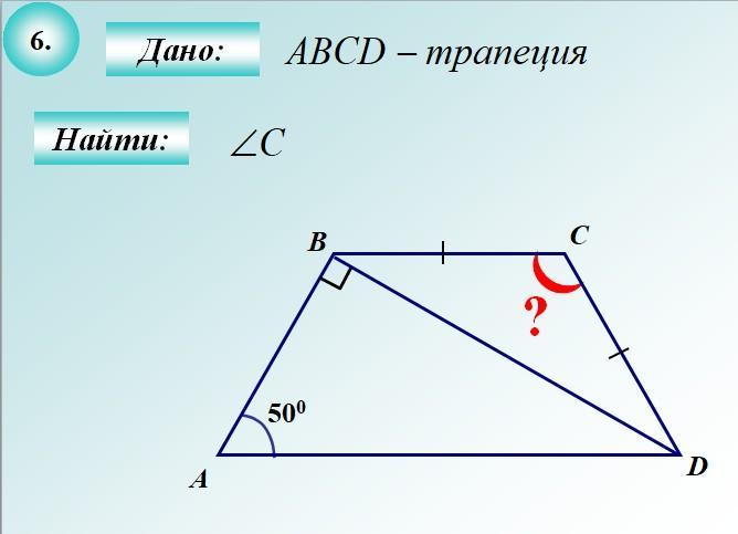 1. Основания трапеции параллельны: AD||BC, тогда можно найти угол ABC, рассматривая его как односторонний с углом BAD в параллельных прямых, пересечённых секущей: ABC = 180° - угол BAD = 130°;