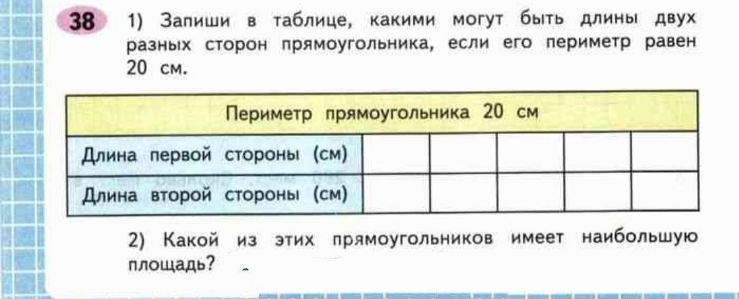 1) Тк Р=2*(a+b) , то полупериметр , то есть сумма «соседних» сторон = a+b= 20:2=10. Это стороны: 1 и 9, 2 и 8 , 3 и 7, 4 и 6, 5 и 5. 2) наибольшую площадь имеет прямоугольник со сторонами 5 и 5 , то есть квадрат. ( квадрат является частным случаем прямоугольника). если что-то не понятно, пишите в комментах. Успехов в учёбе! justDavid