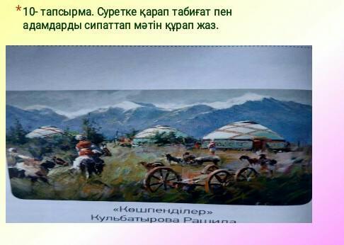 Казак халкы кошпенди халык болган.Бул суйтетте биздин дастуримизди,салтымызды корсеткен. жанеде казагымыздын Кен байтак адеми корикти табигаты мен таза ауасын молдирднй суын корсеткен.Суретте казактардын коныс аударган уйи кииз уй