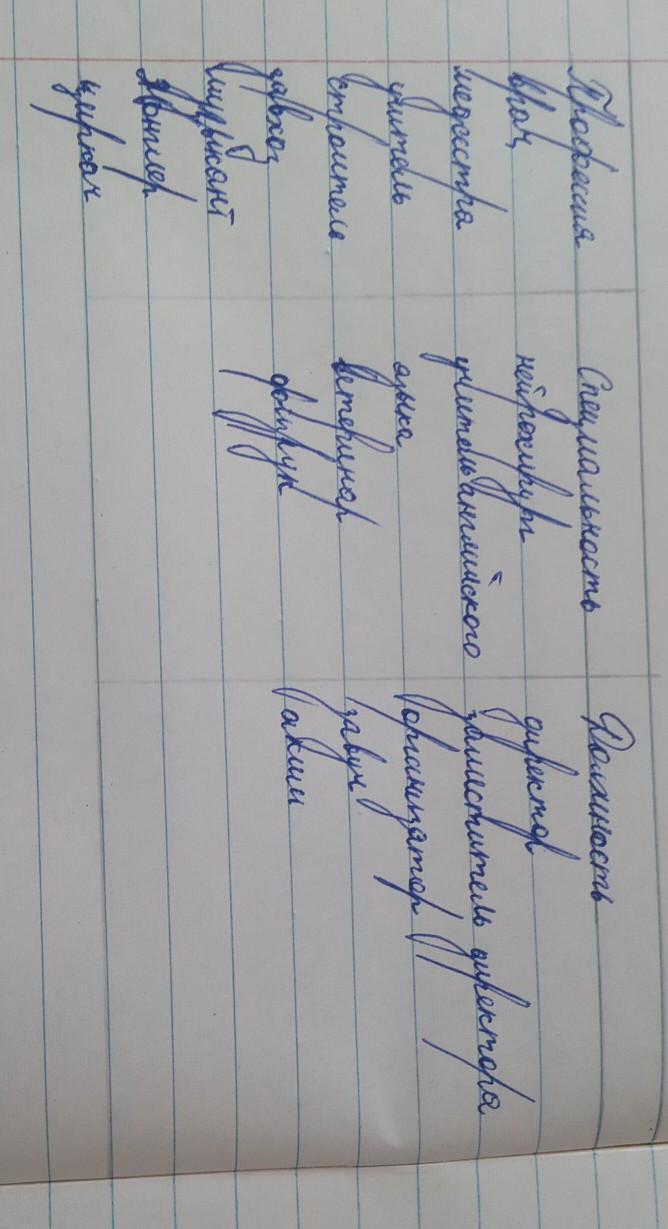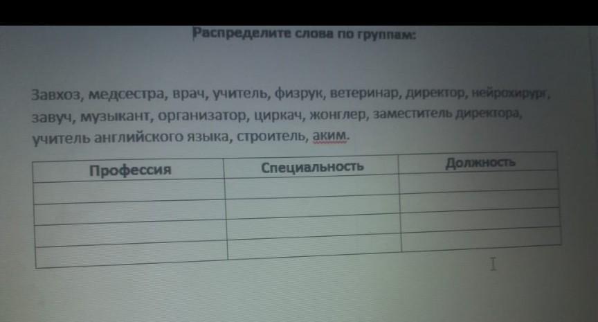 Распределите слова по группам: Завхоз, медсестра, врач, учитель, физрук, ветеринар, директор, нейрохирург, завуч, музыкант, организатор, циркач, жонглер, заместитель директора, учитель английского языка, строитель, аким.