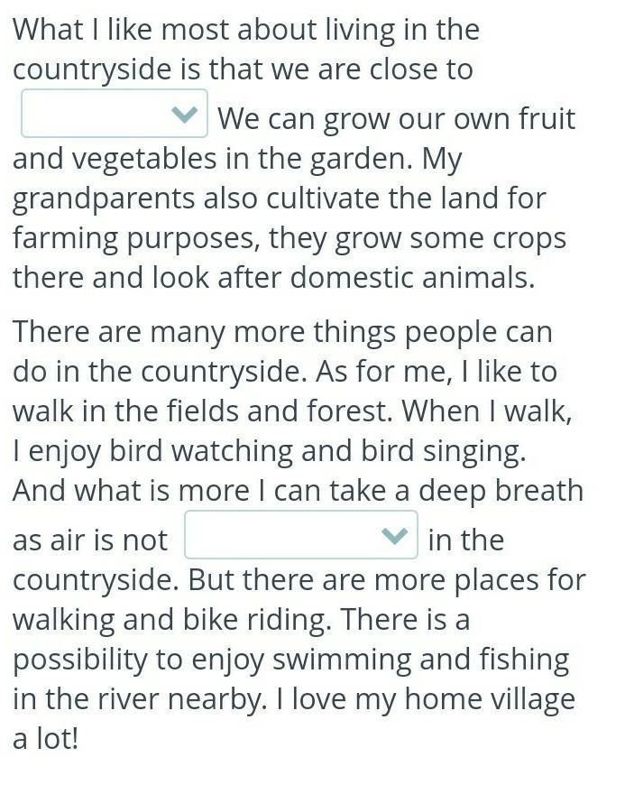 Что мне больше всего нравится в жизни в деревне, так это то, что мы близки к природе. Мы можем выращивать собственные фрукты и овощи в саду. Мои бабушка и дедушка также обрабатывают землю для сельскохозяйственных целей, выращивают там урожай и ухаживают за домашними животными. В деревне можно сделать еще много вещей. Что касается меня, то я люблю гулять по полям и лесу. Когда я гуляю, мне нравится наблюдать за птицами и петь птицы. А еще я могу сделать глубокий вдох, ведь в деревне воздух не загрязнённый. Но есть еще места для прогулок и катания на велосипеде. В близлежащей реке можно искупаться и порыбачить. Я очень люблю свою родную деревню!