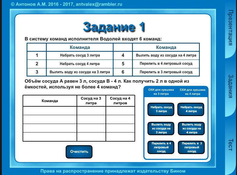 В систему команд исполнителя Водолей входят 6 команд: объем сосуда А равен 3л, сосуда B- 4л. Как получить 2л в одной из ёмкостей, используя не более 4 команд?