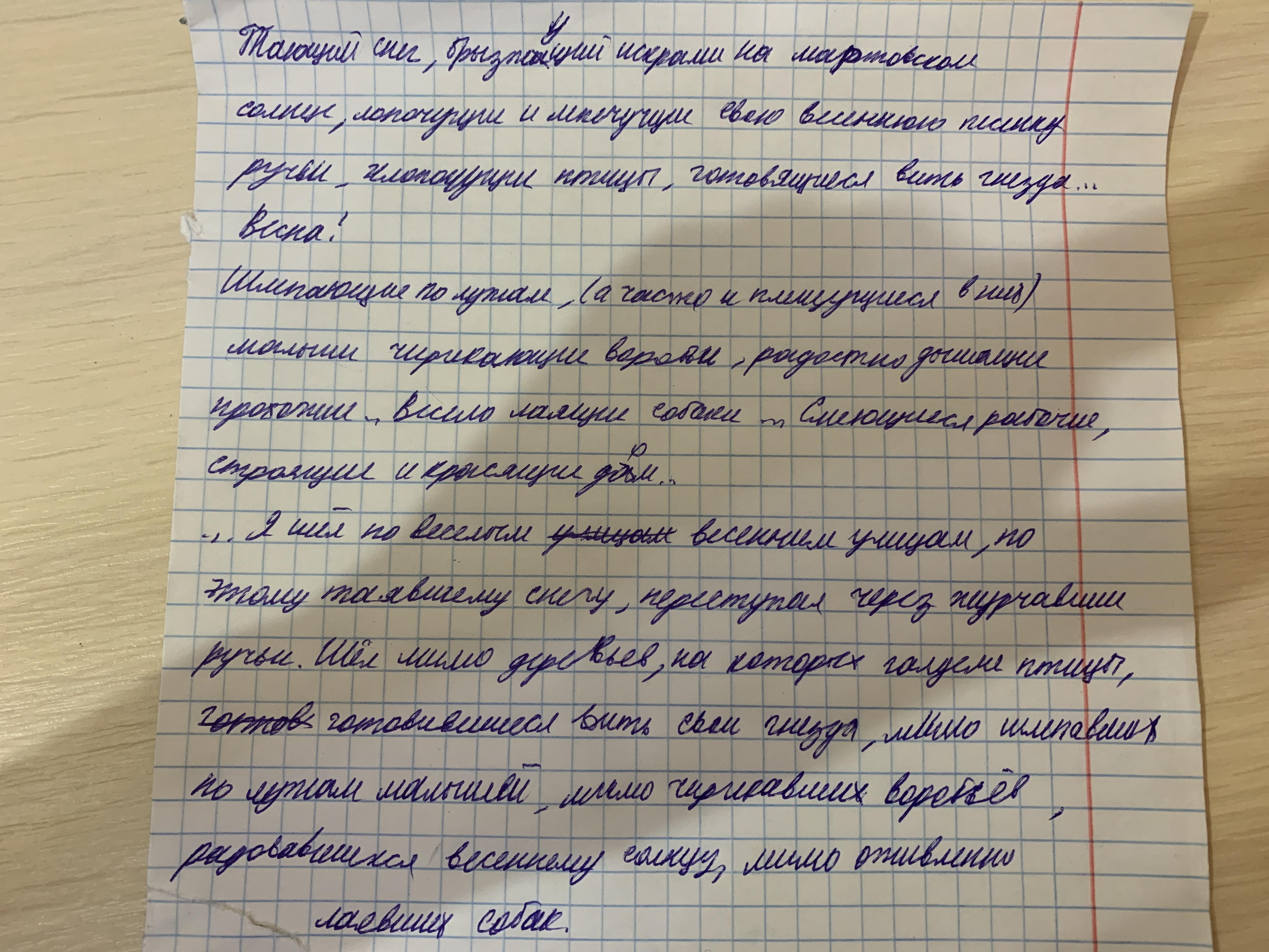...Я шёл по веселым весен__м улицам, по этому та_вш_му снегу переступая через журчавш_е ручьи. Шёл мимо деревьев на которых галдели птиц_ готов_вш_еся вить свои гнёзда, мимо шлёп_вш_х по лужам малышей, мимо чирик_вших воробьёв рад_вавш_хся весен__му солнцу, мимо оживлённо ла_вш_х собак.