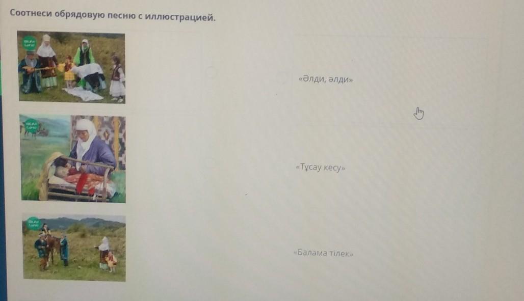 На первой картинке это «Тұсау кесу» На второй это «Әлди,Әлди» А на третий «Балама тилек»Это очень легко если вниматильно слушать о чём учитель говорит на уроке;-;