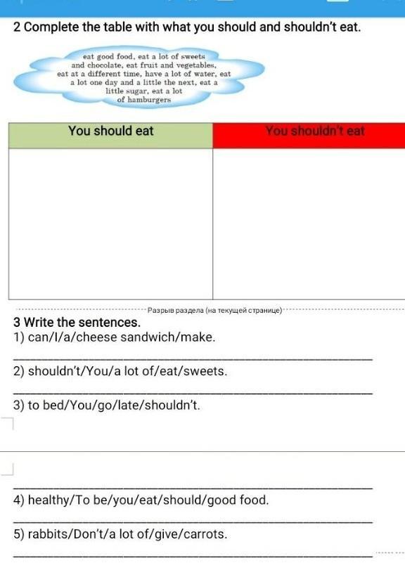 2. В таблицу в колонку You should eat пишем: good food; fruit and vegetables; eat at a different time; have a lot of water; eat a little sugar.