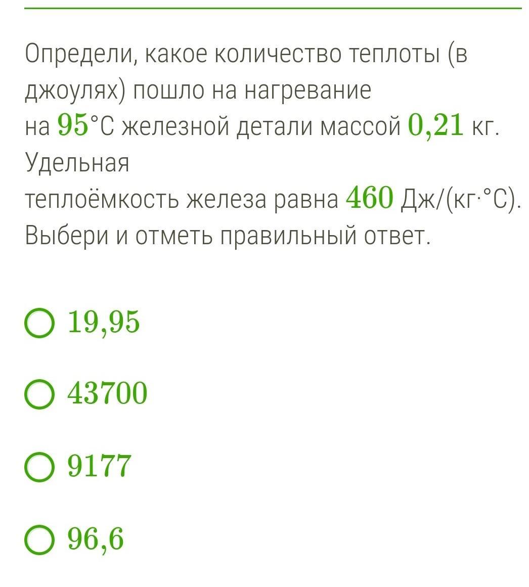 Q=460Дж\кг*С * 0,21 кг * 95 С = 9177 Дж