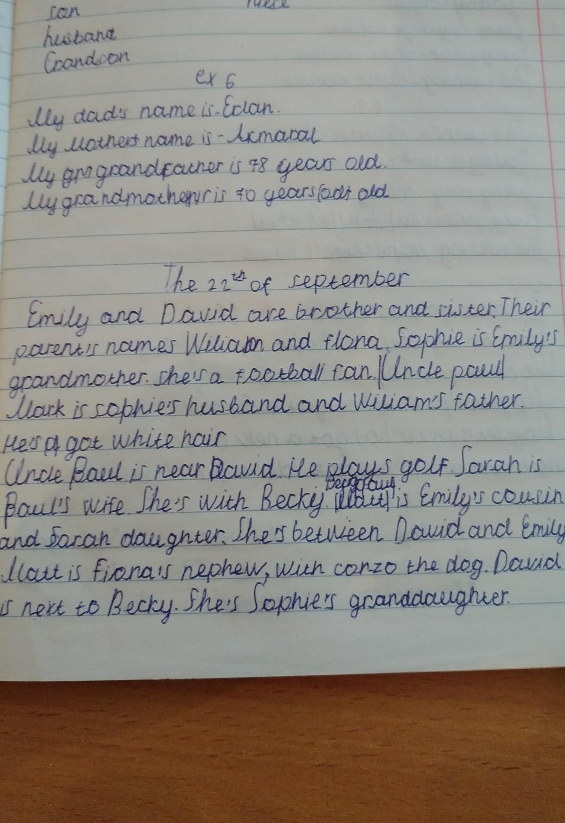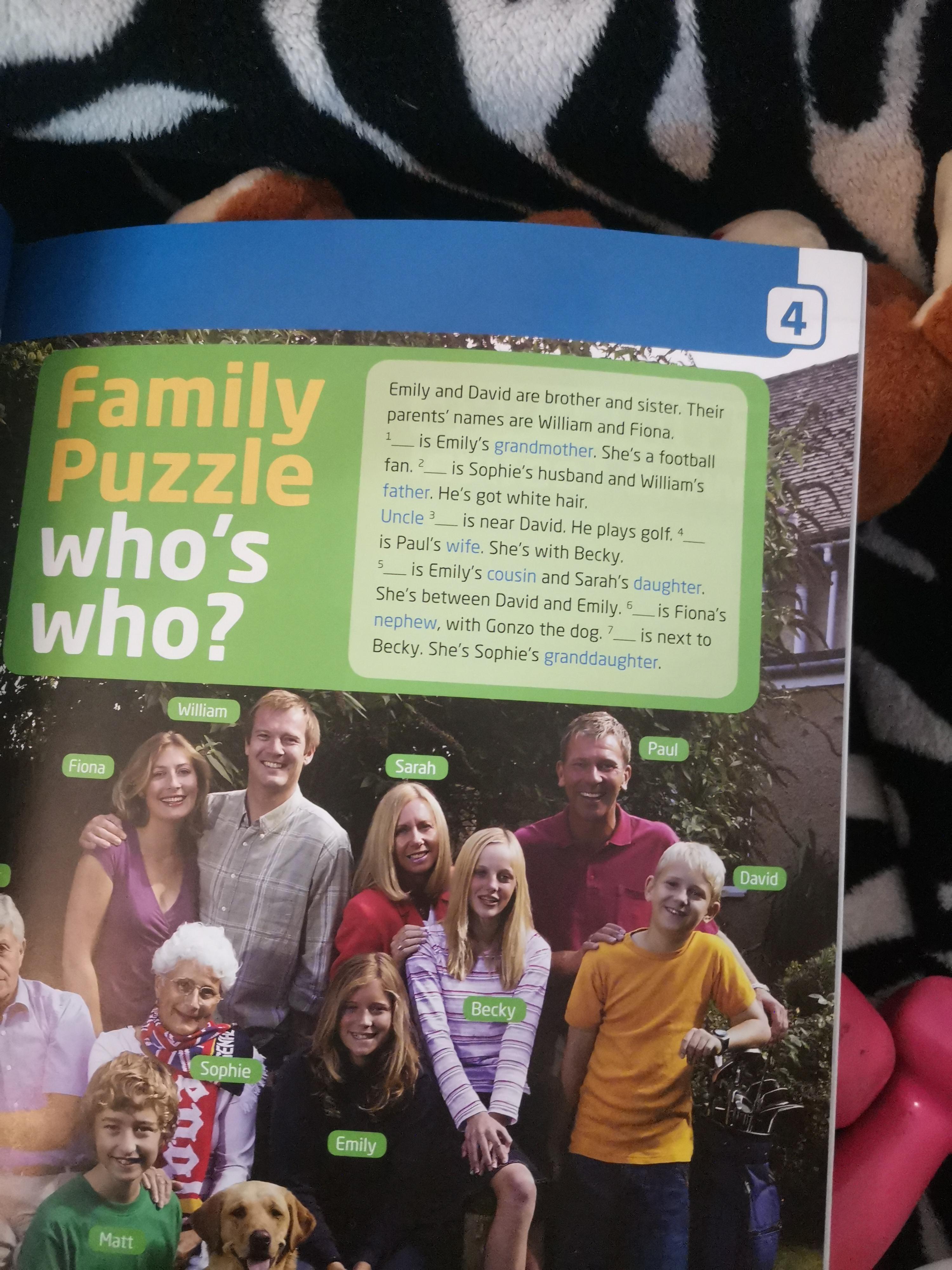 Open your Student’s Book at page 40. Look at the puzzle and the photo of Mitchell family on page 41. Write the names. Then listen and check. Write the answers in your notebook. (Откройте на странице 40. Посмотрите на загадку и фотографию семьи Митчелл на странице 41. Напишите имена. Потом послушайте и проверьте. Запишите ответы в тетрадь.) (Письменно)