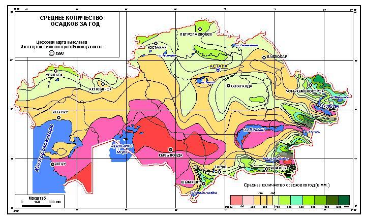 Если посмотреть на карту осадков Казахстана, которая дана ниже в приложении, то можно увидеть, что среднее количество осадков 326 мм в год.