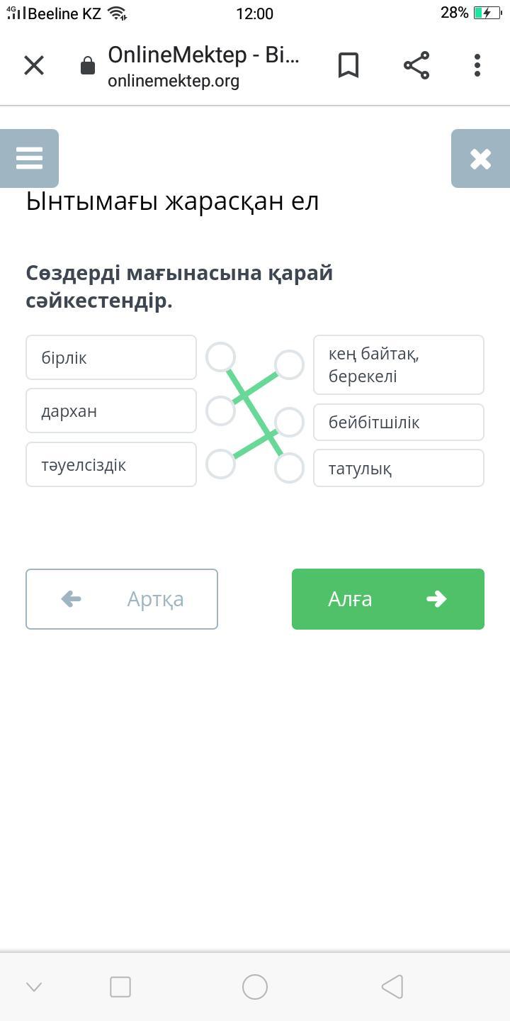 Сөздерді мағынасына қарай сәйкестендір. бірлік,дархан,тәуелсіздік,кең байтақ берекелі,бейбітшілік,татулық.
