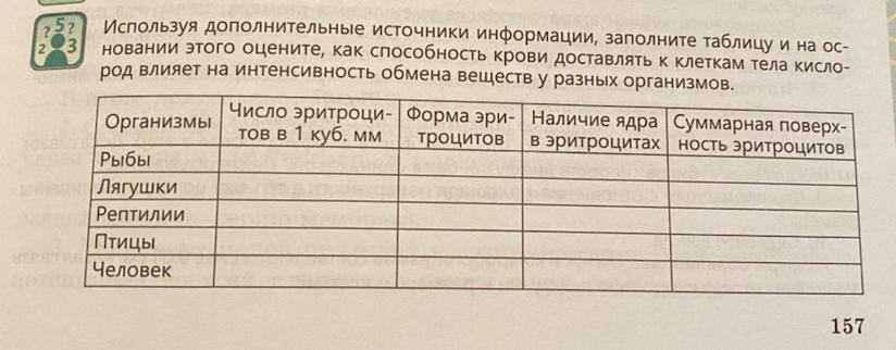 Используя дополнительные источники информации, заполните таблицу и на основании этого оцените, как способность крови доставлять к клеткам тела кислород влияет на интенсивность обмена веществ у разных организмов.