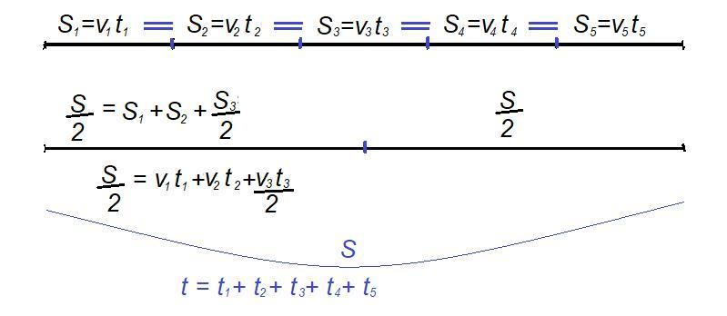 Так как участки пути одинаковые, то первая половина пути состоит из всего первого участка, всего второго участка и половины третьего участка.