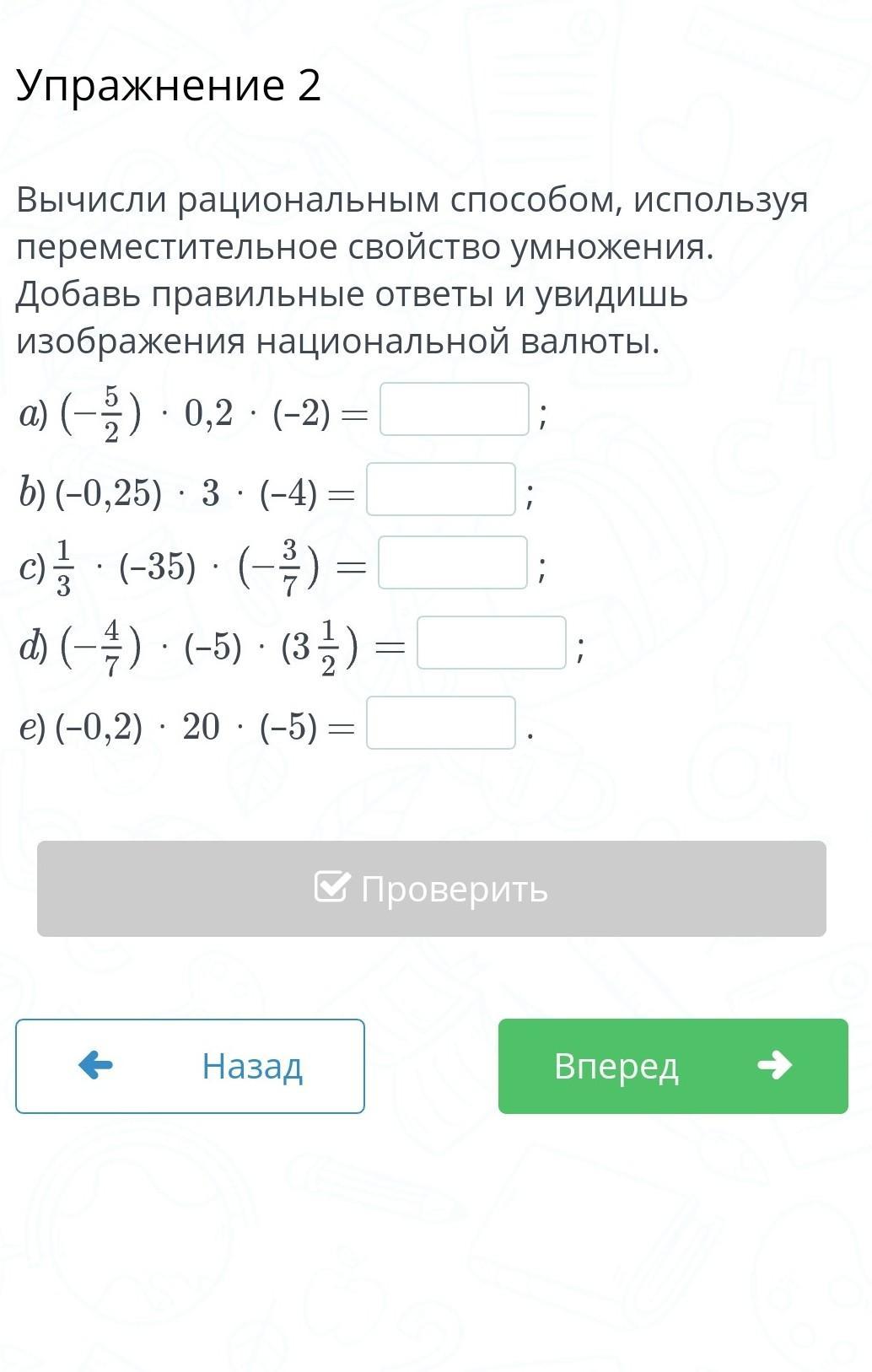 Вычисли рациональным способом, используя переместительное свойство умножения. Добавь правильные ответы и увидишь изображения национальной валюты.