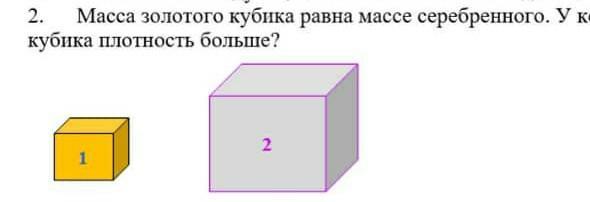 масса золотого кубика ровна массе серебренного. У которого кубика плотность больше?