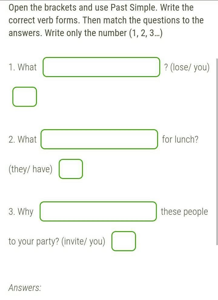 Open the brackets and use Past Simple. Write the correct verb forms. Then match the questions to the answers. Write only the number (1, 2, 3…)