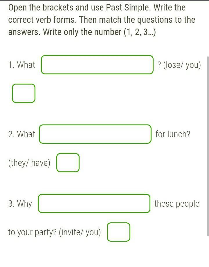 Open the brackets and use Past Simple. Write the correct verb forms. Then match the questions to the answers. Write only the number (1, 2, 3…)