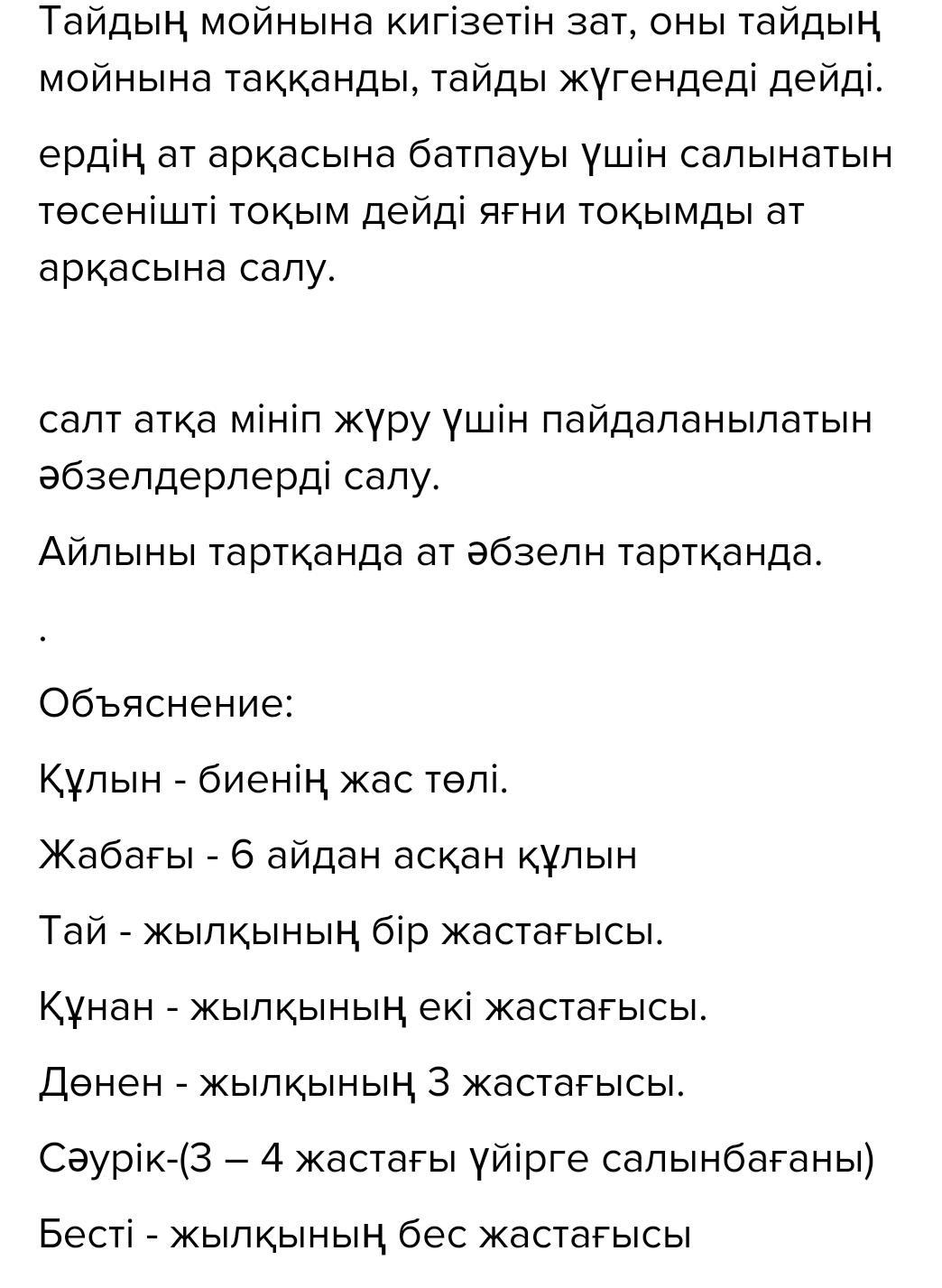 үлкендердің көмегімен «тайды жұгендегенде»,«тоқым салғанда»,«ер салғанда»,«айылын тартқанда»сөздеріне анықтама жаз.Жылқы малының атауларын жасына қарай теріп жаз мысалы:құлын...