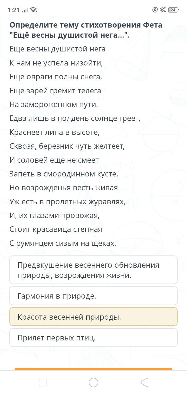 Тема стихотворения - весна. Впервой части Фет описывает весну, ещё не пробудившуюся от сна. Далее, во второй части, делает вывод, что весна уже рядом.