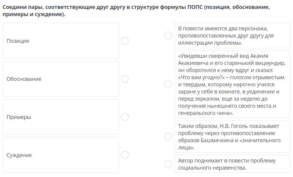 Соедини пары, соответствующие друг другу в структуре формулы ПОПС (позиция, обоснование, примеры и суждение).