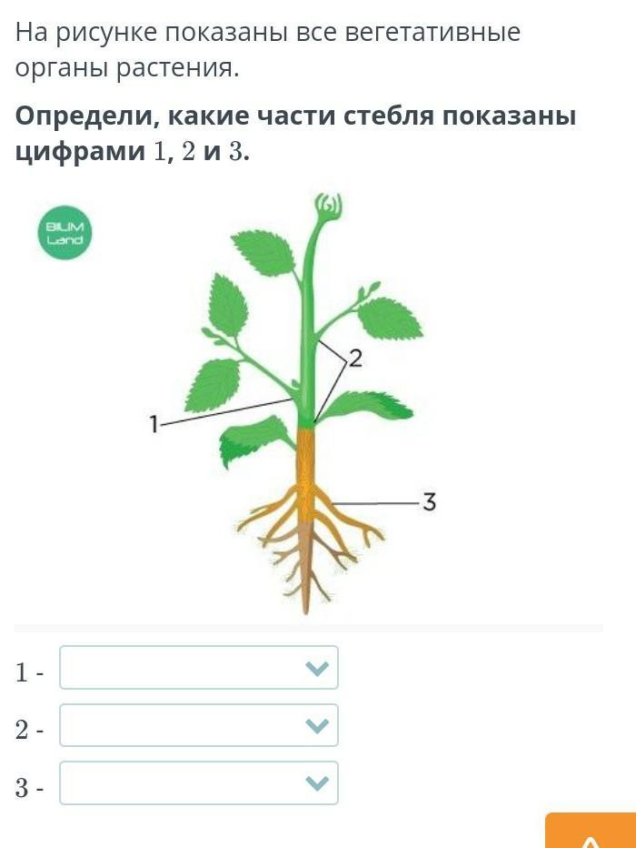 варианты ответов: узел, междоузлие, почки, стебель, лист, корень.