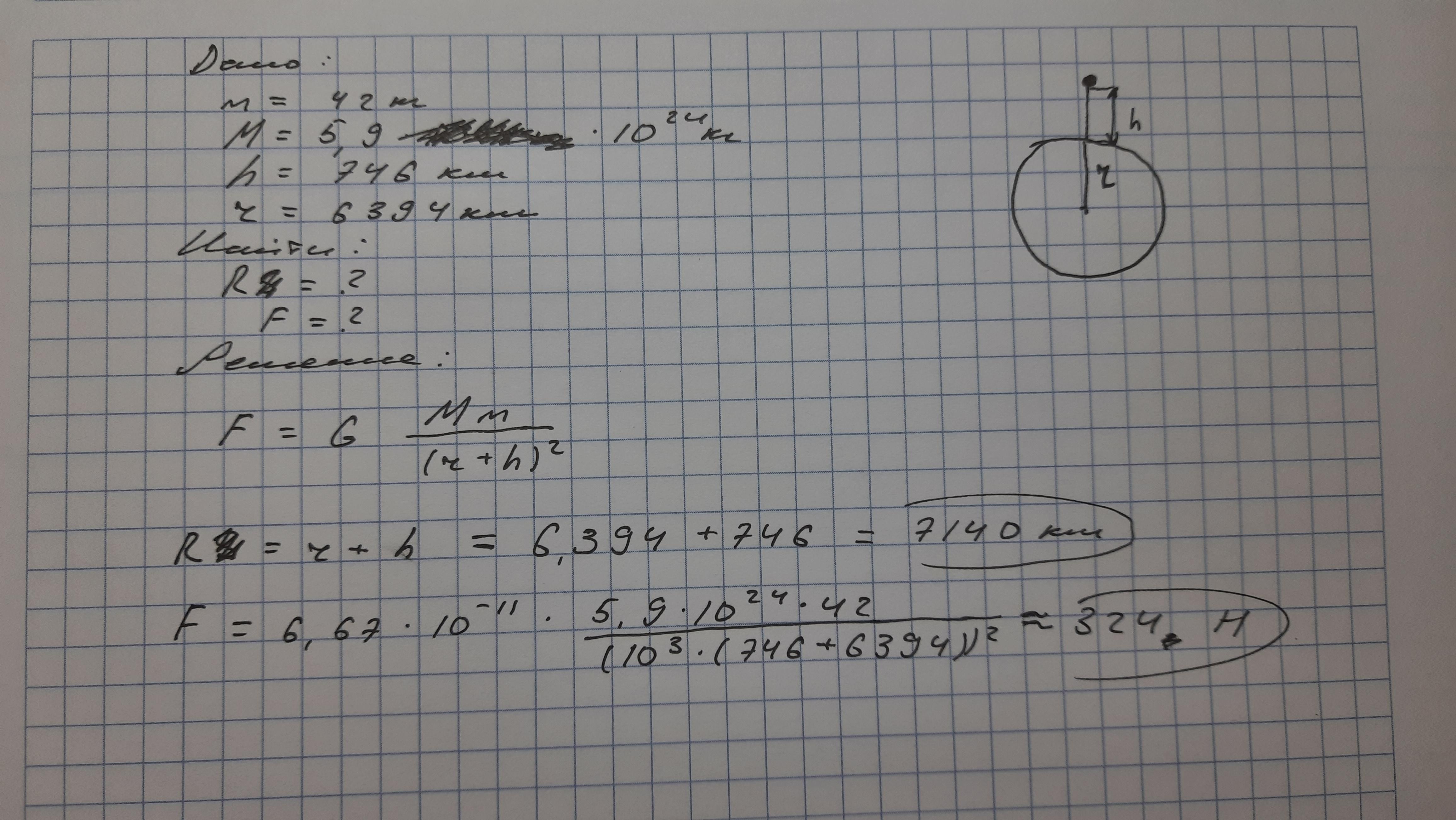 СРОООЧНООО Искусственный спутник, масса которого — 42 кг, находится на орбите на расстоянии 746 км над поверхностью Земли. Масса Земли составляет 5,9⋅1024 кг, а её радиус равен 6394 км.