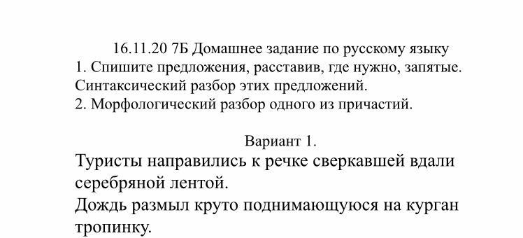 туристы направились к речке, сверкавшей вдали серебряной лентой (повествовательное, невоскл., распростр., простое