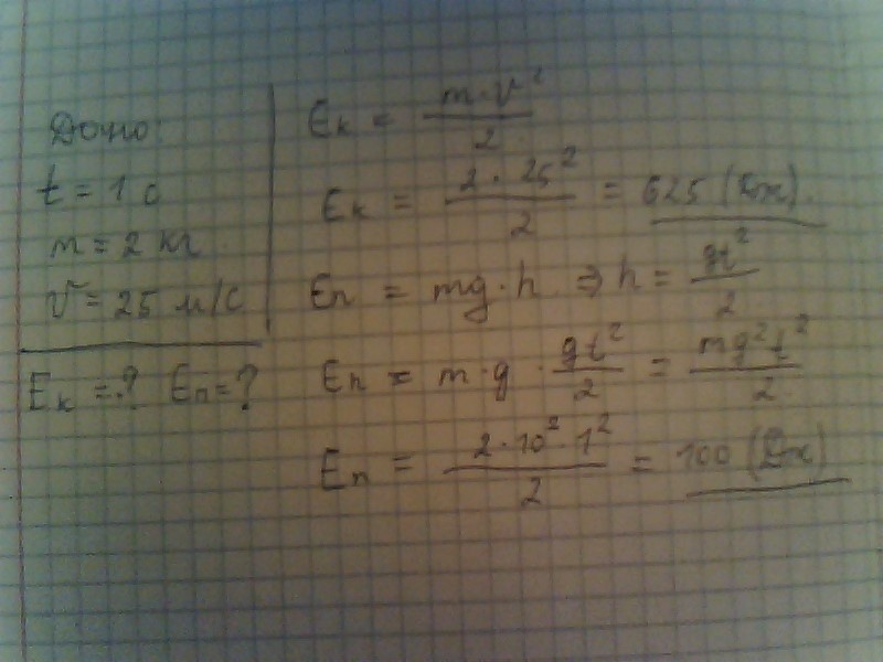 скоростью 25 м/с. Чему будут равны кинетическая и потенциальная энергия