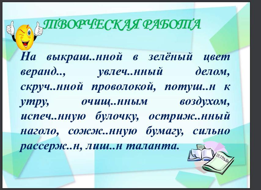 "На выкрашенной в зелёный цвет веранде, увлечённый делом, скрученной проволокой, потушен к утру, очищенным воздухом, испечённую булочку, остриженный наголо, сожжённую бумагу, сильно рассержен, лишён таланта." цитата человека снизу