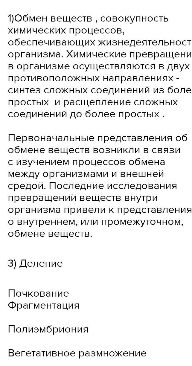 Условно процесс обмена веществ можно разделить на три этапа: 1)Первый этап — ферментативное расщепление белков, жиров и углеводов до растворимых в воде аминокислот, моно- и дисахаридов, глицерина, жирных кислот и других соединений, происходящее в различных отделах желудочно-кишечного тракта, и всасывание их в кровь и лимфу 2)Второй этап — транспорт питательных веществ кровью к тканям и клеточный метаболизм, результатом которого является их ферментативное расщепление до конечных продуктов. Часть этих продуктов используется для построения составных частей мембран, цитоплазмы, для синтеза биологически активных веществ и воспроизведения клеток и тканей. Расщепление веществ сопровождается выделением энергии, которая используется для процесса синтеза и обеспечения работы каждого органа и организма в целом. 3)Третий этап — выведение конечных продуктов метаболизма в составе мочи, кала, пота, через легкие в виде CO2 и т. д.