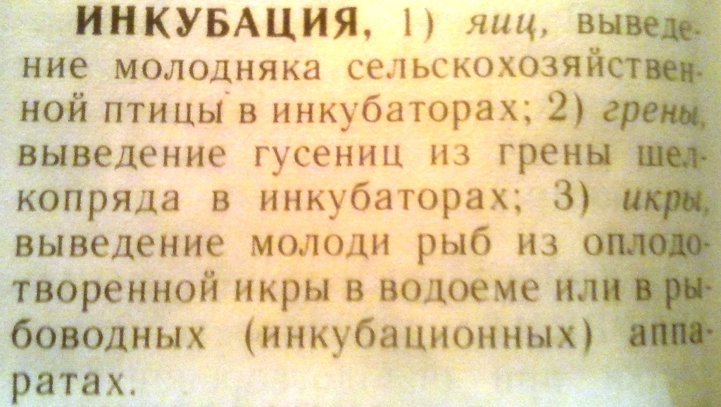 Второе значение Инкубация - (incubation) - 1. Процесс развития яйца или каких-либо внедрившихся в организм микробов без внешних проявлений. 2. Обеспечение искусственно поддерживаемых условий для недоношенных младенцев, которые создаются в инкубаторе.;