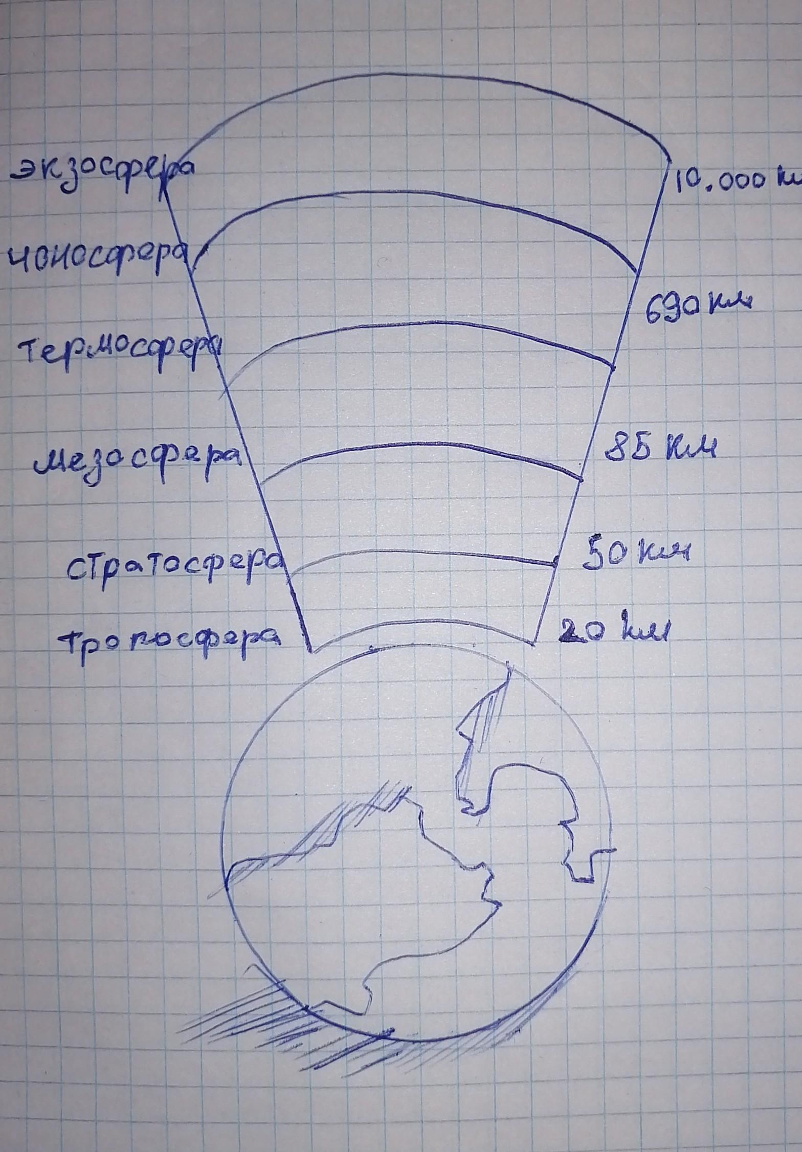 (тропосфера, стратосфера, мезосфера, термосфера, экзосфера).