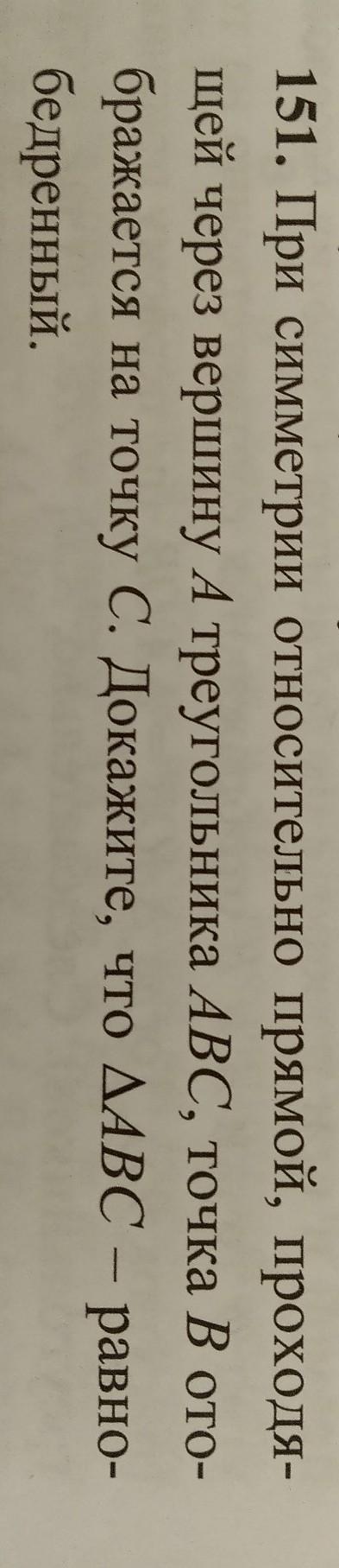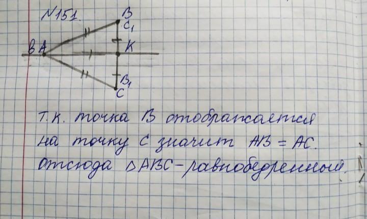 № 151. При симметрии относительно прямой, проходящей через вершину А треугольника АВС, точка В отображается на точку С. Докажите, что треугольник АВС - равнобедренный.
