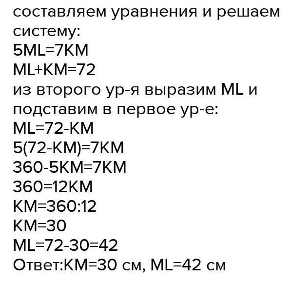 Вычисли длины частей отрезка, если 5ML=7KM.