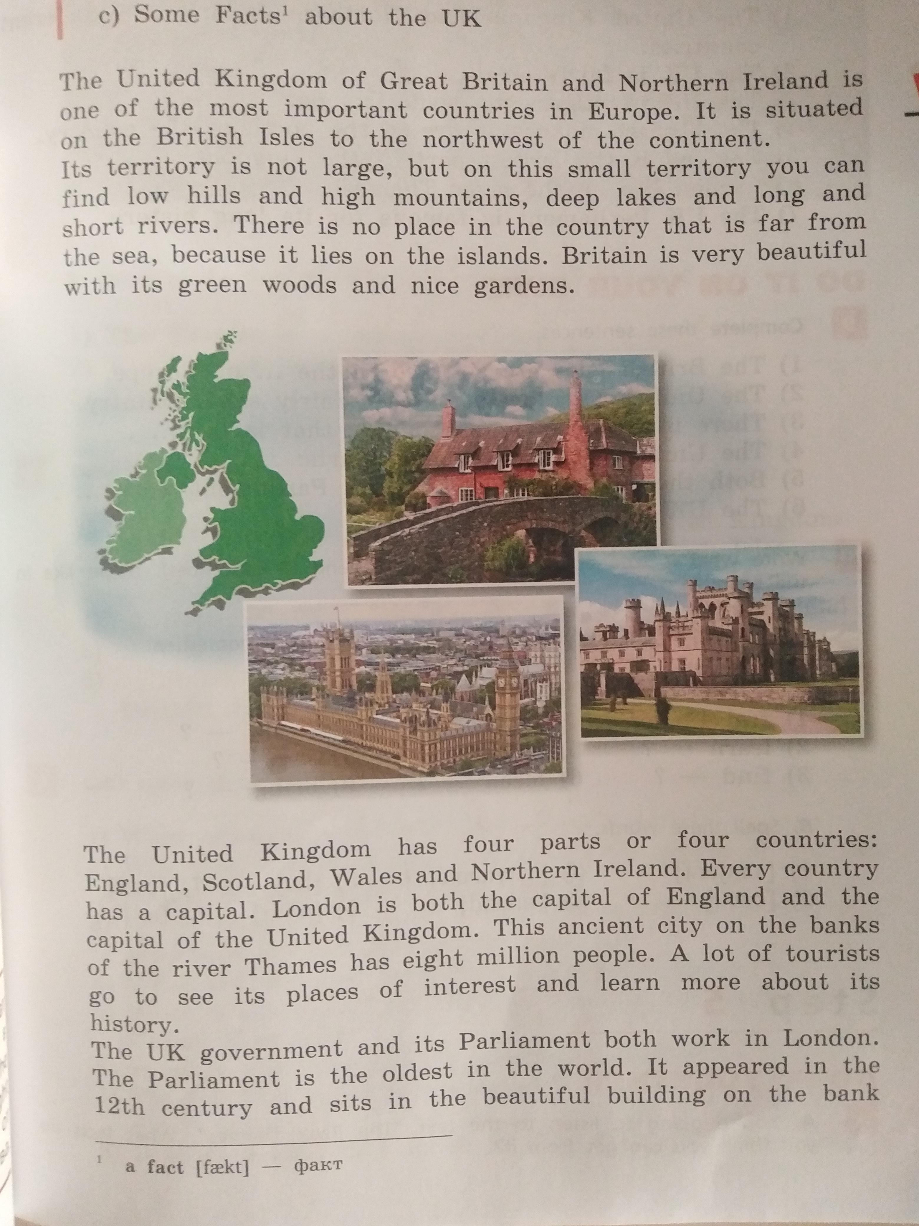 Королівство Великобританії та Північної Ірландії є однією з найважливіших країн Європи. Він розташований на Британських островах на північному заході континенту. Його територія не велика, але на цій невеликій території можна зустріти невисокі пагорби та високі гори, глибокі озера та довгі та короткі річки. У країні немає місця далеко від моря, бо воно лежить на островах. Британія дуже гарна своїми зеленими лісами та гарними садами. Великобританія має чотири частини або чотири країни: Англію, Шотландію, Уельс та Північну Ірландію. Кожна країна має столицю. Лондон є одночасно столицею Англії та столицею Великобританії. У цьому древньому місті на березі річки Темзи живе вісім мільйонів людей. Багато туристів їдуть, щоб побачити визначні місця та дізнатись більше про його історію. Уряд Великобританії та його парламент працюють у Лондоні. Парламент - найстаріший у світі. Він з’явився у столітті