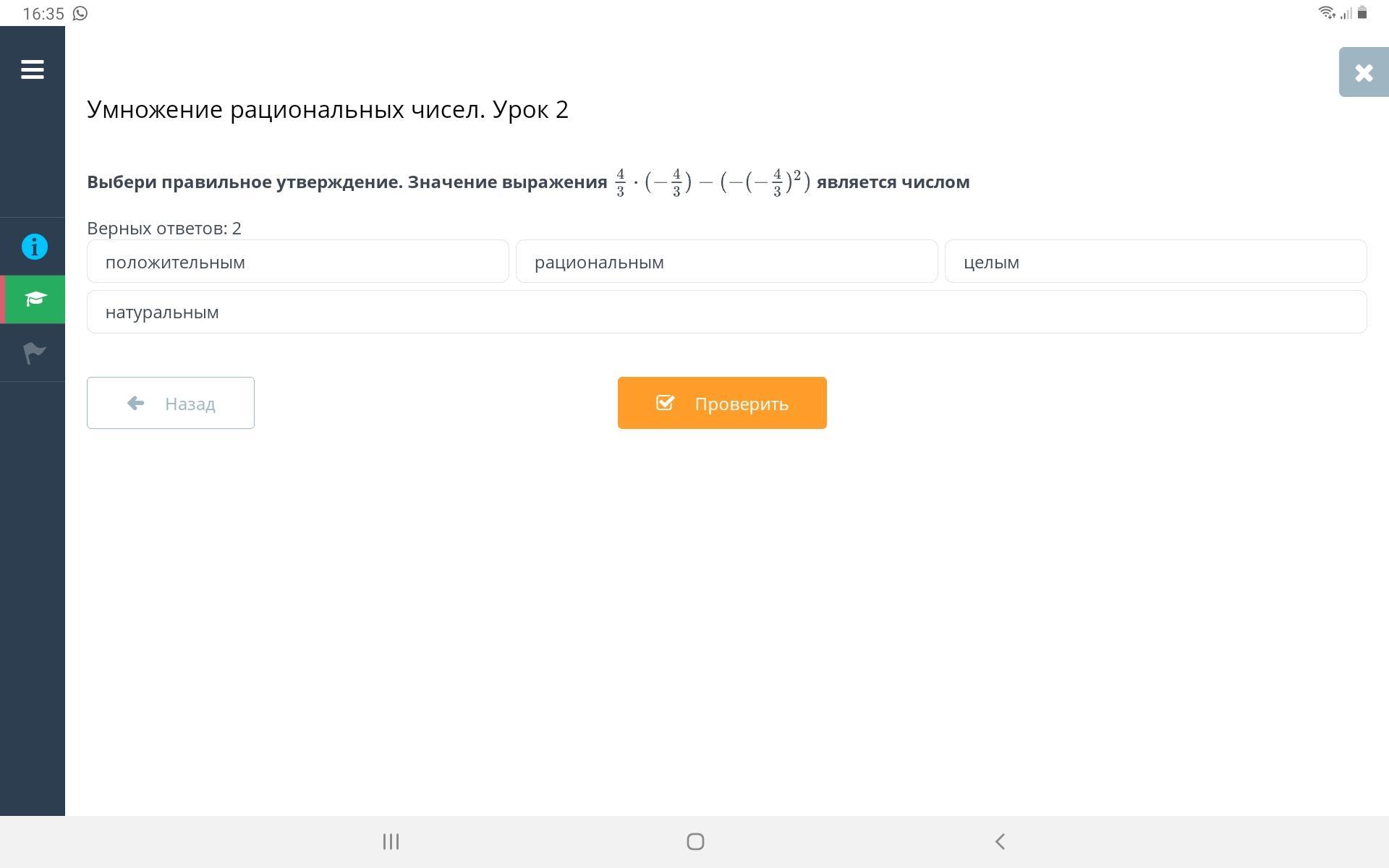 Выбери правильное утверждение.Значенте выражения 4/3•(-4/3)-(-(-4/3)2) является числом