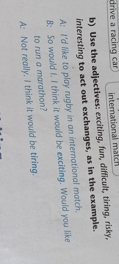 b)Use the adjectives: exciting, fun, difficult, tiring, risky, interesting to act out exchanges, as in the example.
