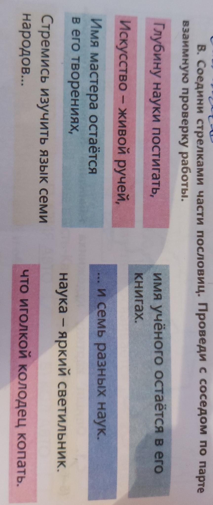 В. Соедини стрелками части пословиц. Проведи с соседом по парте