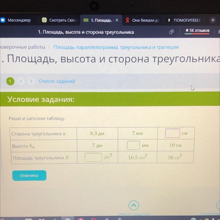 1. S = 1/2 * 8,3 * 7 = 0,5 * 8,3 * 7 = 29,05 дм²