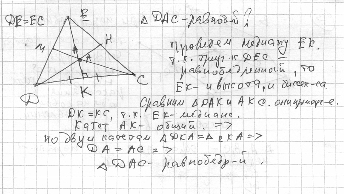 В равнобедренном треугольнике DEC с основанием CD медианы CM и DH пересекаются в точке А. Докажите что треугольник DAC также равнобедренный.