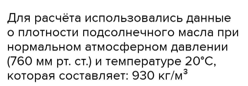 Для расчёта использовались данные о плотности подсолнечного масла при нормальном атмосферном давлении (760 мм рт. ст.) и температуре 20°C, которая составляет: 930 кг/м³
