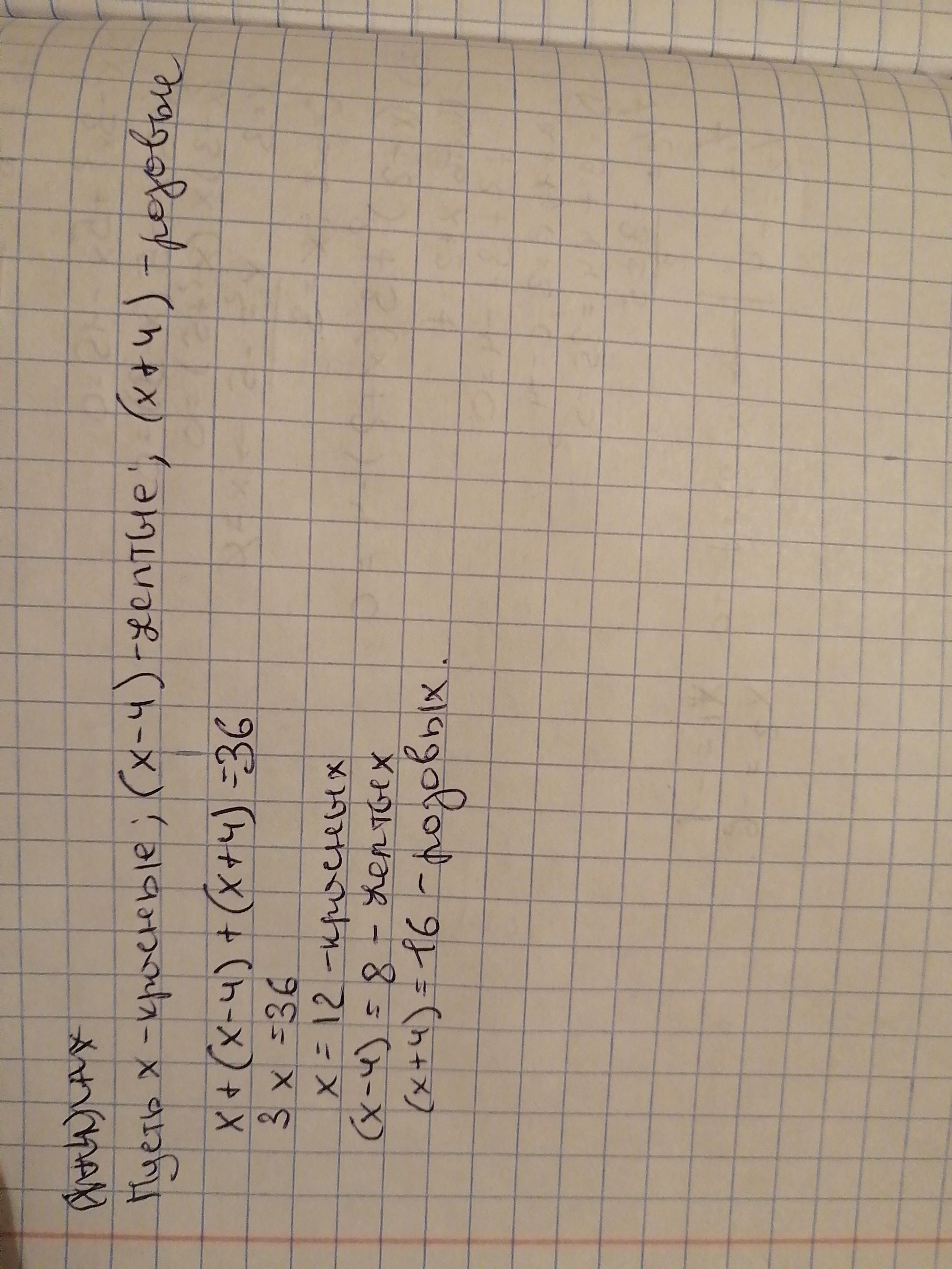Праздничный торт украшало 36 розочек из крема красного,жёлтого и розового цвета. Красных розочек было на 4 больше, чем жёлтых,и на 4 меньше, чем розовых. Сколько розочек каждого цвета украшало торт?