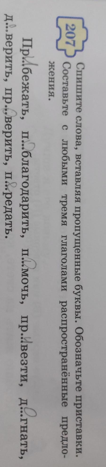 Спишите слова вставляя пропущенные буквы.Обозначьте приставки.Составьте с любыми тремя глаголами распространённые предложения. Упр 207