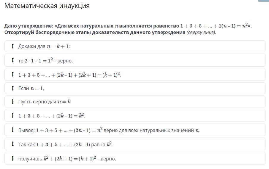 Дано утверждение: «Для всех натуральных n выполняется равенство 1 + 3 + 5 + … + 2(n – 1) = n2». Отсортируй беспорядочные этапы доказательств данного утверждения (сверху вниз).