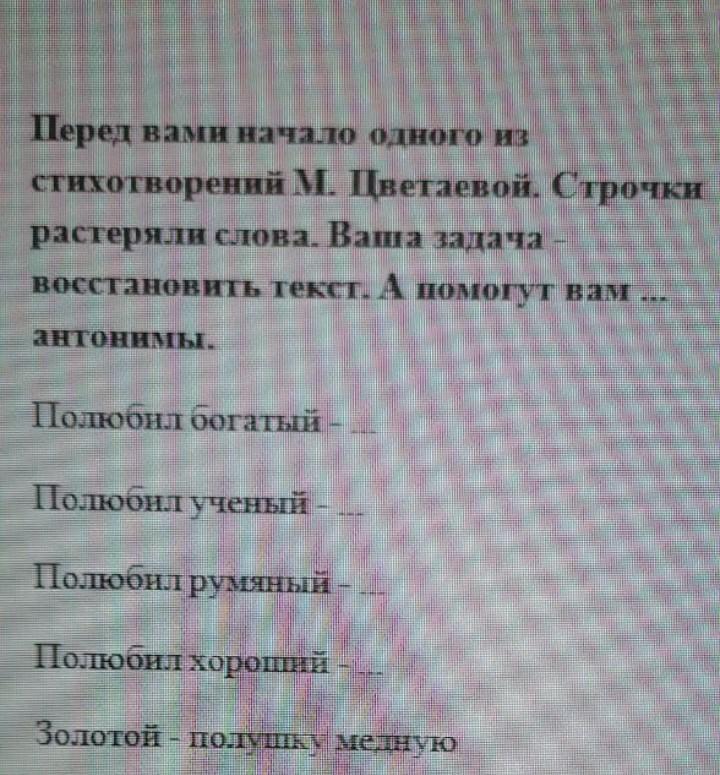Полюбил богатый -- бедную, Полюбил ученый --глупую, Полюбил румяный -- бледную, Полюбил хороший вредную: Золотой полушку медную.