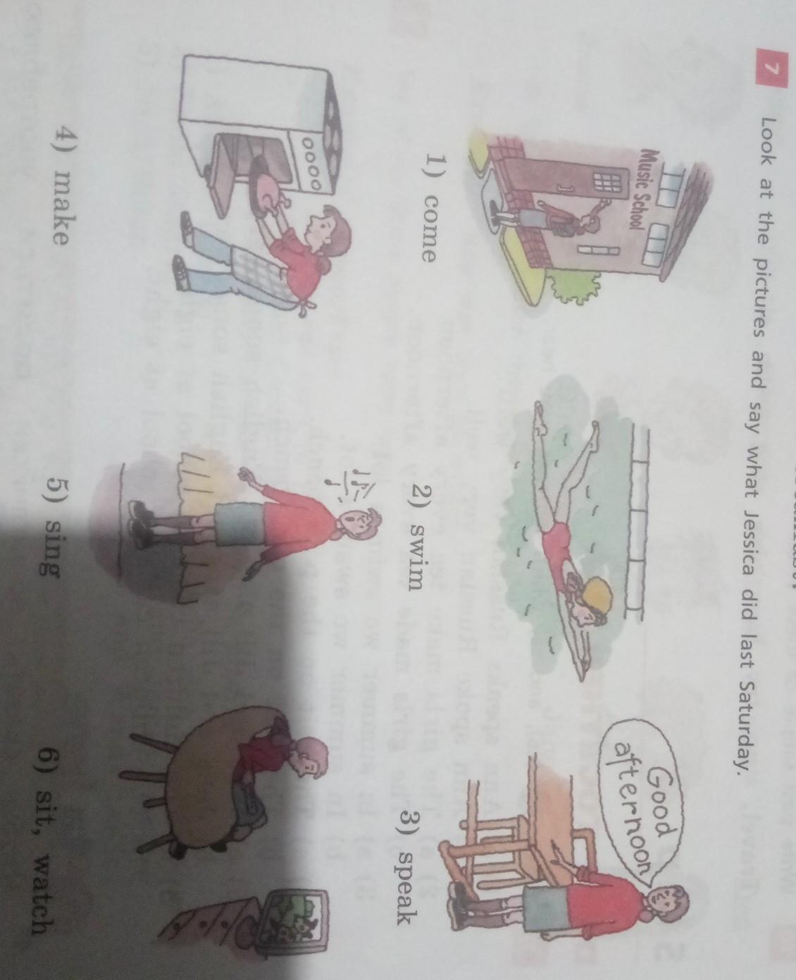 speak-говорить,sit,watch-сидеть,смотреть,swim-плавать