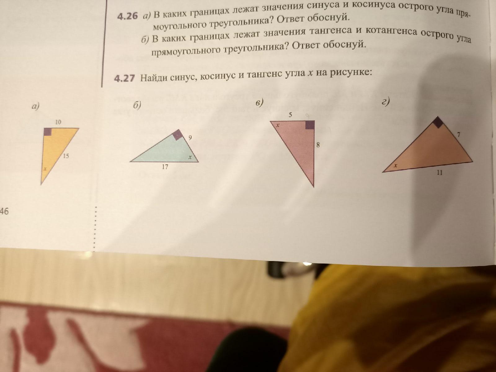 Геометрия 8 класс.Найди синус,косинус и тангенс угла x на рисунке(только под буквой A)