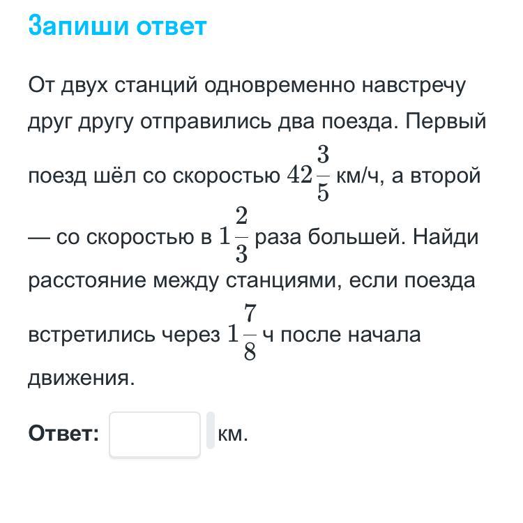 Первый поезд ехал 1 7/8 часа со скоростью 42 3/5 км/ч найдем все пройденое им расстояние